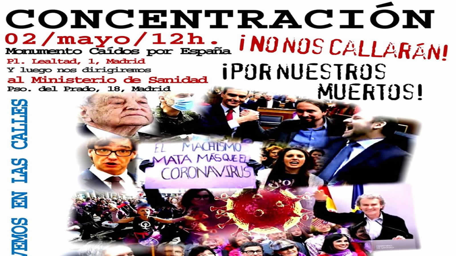 “Concentración 2 de mayo a las 12h. ¡No nos callarán! Por nuestros muertos!”, se puede leer en el cartel de la convocatoria que este partido está haciendo circular ya entre sus simpatizantes, justificando la convocatoria en “el tratamiento a nuestros muertos, la incompetencia y la falta de rigor de este Gobierno merecen una respuesta frontal de la sociedad española”.