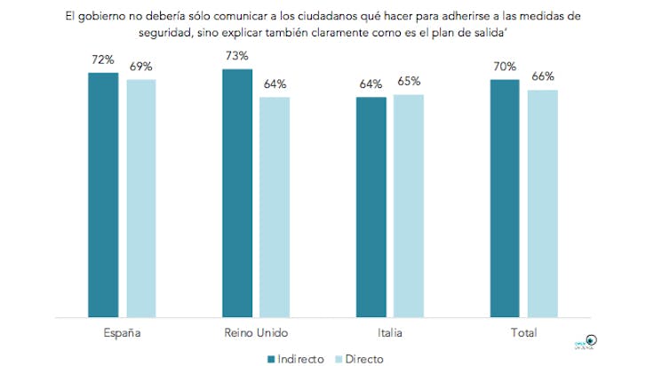 Este consenso es igual de significativo ante la afirmación de que “el gobierno no debería sólo comunicar a los ciudadanos qué hacer para adherirse a las medidas de seguridad, sino explicar también claramente como es el plan de salida”. En definitiva, se muestra claramente el desacuerdo de los ciudadanos sobre las políticas de comunicación de los gobiernos en los tres países encuestados.
