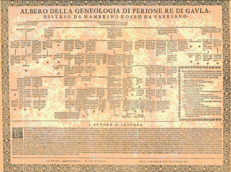 En este punto nos parece oportuno mencionar el impreso titulado Albero della geneologia di Perione re di Gaula (1630). Se trata de una hoja suelta, diseñada por Mambrino Roseo, que recoge al completo la genealogía de Amadís y las relaciones existentes entre los distintos personajes de la saga.